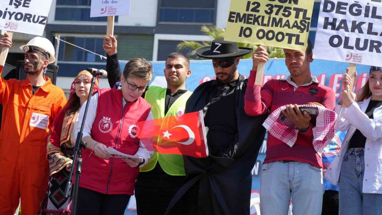 Balıesir’in Edremit ilçesinde 1 Mayıs Emek ve Dayanışma Günü düzenlenen kortej yürüyüşü ve mitingle birlikte coşkuyla kutlandı. Edremit’teki kutlamalara tiyatro oyuncusu Umut Durmaz Zoro kıyafeti ile katılarak dikkatleri çekti.