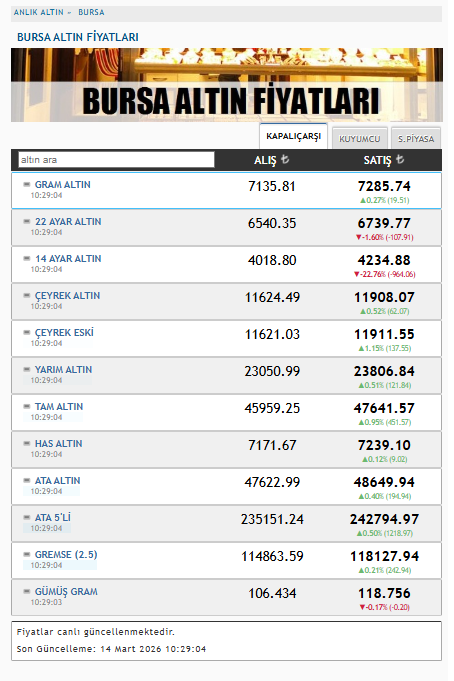 Gram altın 7 bin 135,81 liradan alınırken 7 bin 285,74 liradan satılıyor. Çeyrek altın 11 bin 624 liradan alınırken 11 bin 908 liradan satışa sunuluyor. Yarım altın 23 bin 50 liradan alınırken 23 bin 806 liradan satılıyor. Tam altının alış fiyatı 45 bin 959 lira, satış fiyatı da 47 bin 641 lira seviyesinde işlem görüyor.