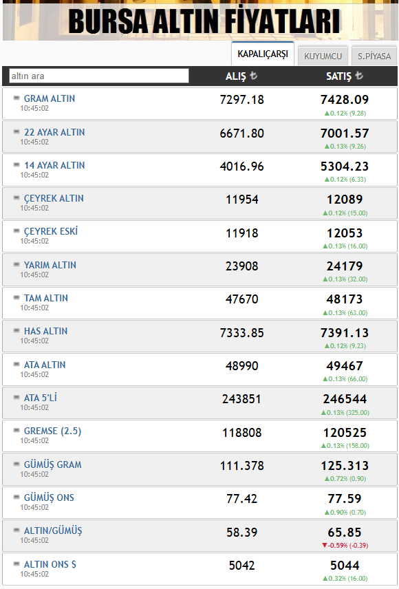 Bugün güncellenen verilere göre, gram altın alış fiyatı 7297,18 satış fiyatı ise 7428,09 TL olarak kaydedildi. Çeyrek altın 11954 alış ve 12089 TL satış fiyatıyla listelenirken, eski çeyrek altın 11918 TL’den alınıp 12053 TL’den satılıyor. Yarım altın 23908 TL alış, 24179 TL satış fiyatıyla işlem görürken; tam altın ise 47670 TL’den alınıp 48173 TL’den satılıyor.