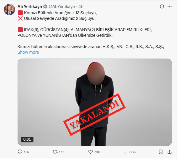 Bakan Yerlikaya, paylaşımında emeği geçen birimleri tebrik ederek, "Hangi bültenle aranırsa aransın, nerede olursa olsun suç işleyenleri bir bir yakalayıp ülkemize geri getiriyoruz. Milletimizin huzuru ve güveni için kararlılıkla çalışıyoruz, çalışmaya da devam edeceğiz." ifadelerine yer verdi.