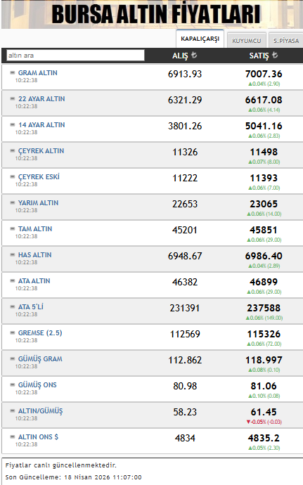 Gram altın alış fiyatı 6.913,93 TL, satış fiyatı 7.007,36 TL seviyesinde işlem görüyor.