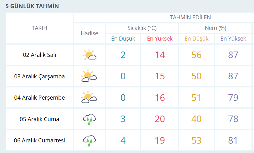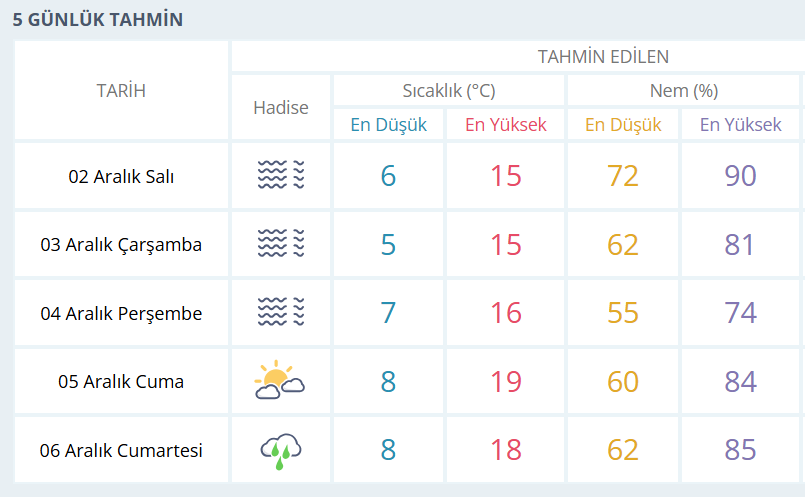 BURSA İÇİN 5 GÜNLÜK HAVA DURUMU TAHMİNİ