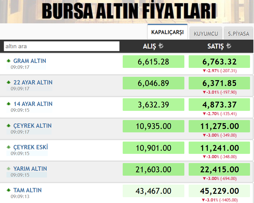 Yarım altın 21.603,00 liradan alınırken 22.415,00 liradan satılıyor. Tam altın fiyatı ise 43.467,00 lira alış ve 45.229,00 lira satış seviyesinde bulunuyor.