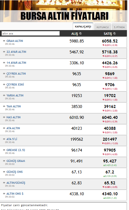 Yatırımcıların ve düğün sezonu alışverişlerinin gözdesi olan çeyrek altın, Bursa Kapalıçarşı’da 9.635 liradan alınırken 9.869 liradan satıldı. Yarım altın 19.253 lira alış, 19.702 lira satış fiyatıyla işlem görürken, tam altının satış fiyatı 39.162 liraya ulaştı.
