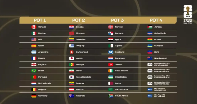 FIFA’dan yapılan açıklamaya göre, kıtalararası play-off eşleşmelerinden gelecek iki ülke ve Avrupa elemelerinden gelecek dört takım 4. torbaya konulacak. Ev sahibi ülkeler Kanada, Meksika ve ABD ise 1. torbada yer alırken, kalan 39 ülke 19 Kasım Çarşamba günü açıklanan ülke puanlarına göre her biri 12 takımdan oluşan dört torbaya dağıtıldı.