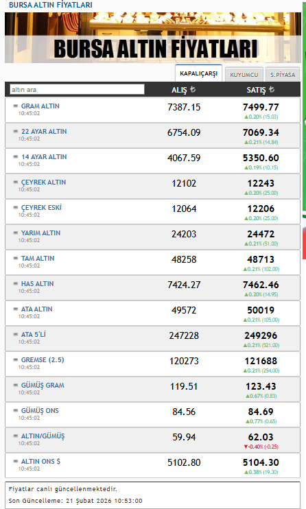 Sabah saatleri itibarıyla gram altın alış fiyatı 7.387,15 lira, satış fiyatı ise 7.499,77 lira seviyesinde işlem görüyor.