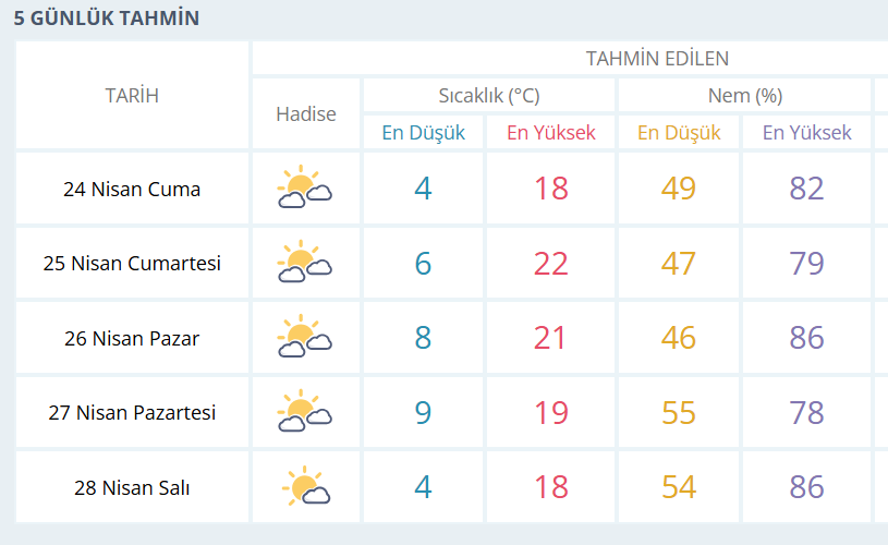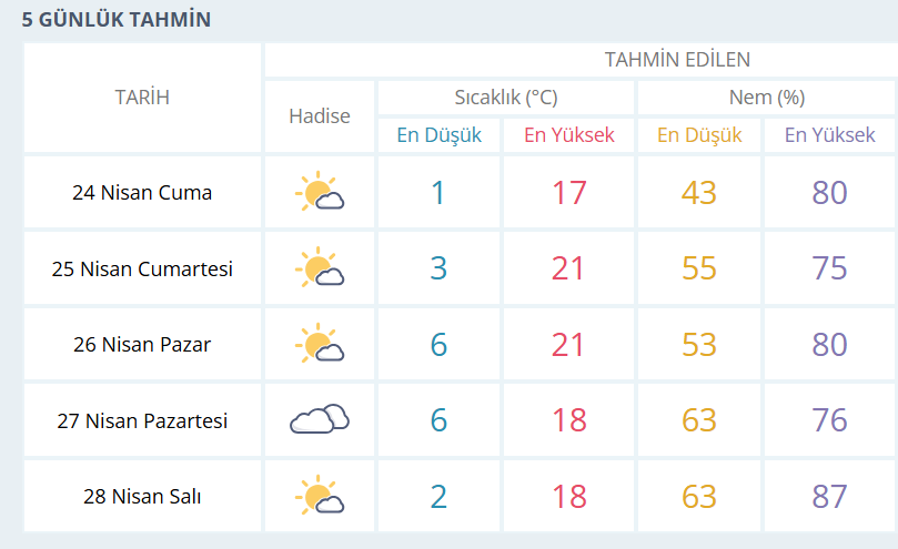 BURSA İÇİN 5 GÜNLÜK HAVA DURUMU TAHMİNİ