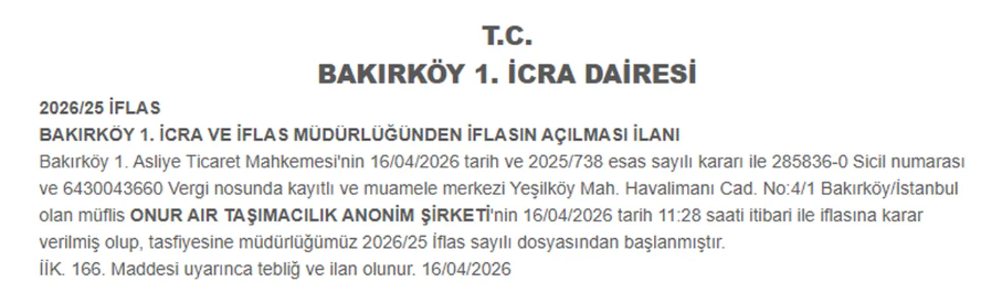 Mahkeme Onur Air hakkında nihai kararını verdi. Dev şirketin iflası mahkeme tarafından tescil edildi. Bakırköy 1. İcra ve İflas Müdürlüğü’nün İlan.gov.tr üzerinden yayımladığı kararda, "Onur Air Taşımacılık Anonim Şirketi'nin 16/04/2026 tarih 11:28 saati itibari ile iflasına karar verilmiş olup, tasfiyesine müdürlüğümüz 2026/25 İflas sayılı dosyasından başlanmıştır." denildi.
