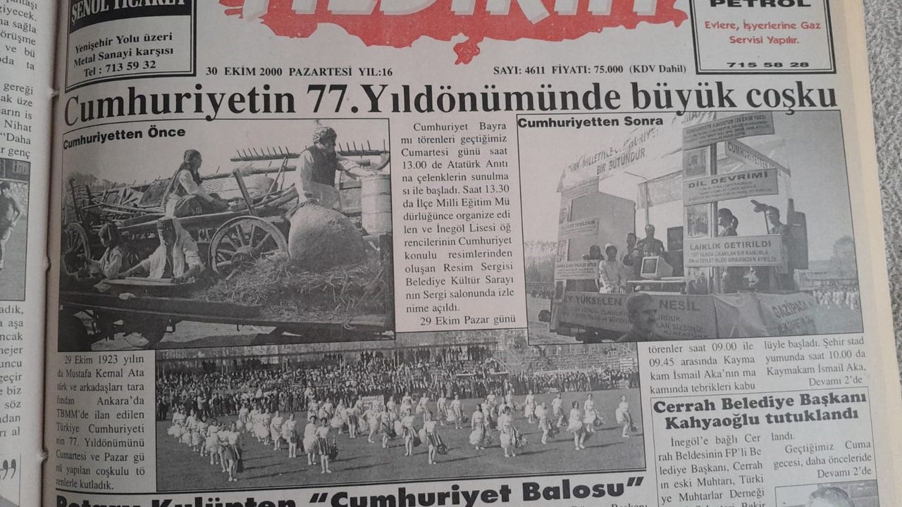 O dönemde gazetemizin 30 Ekim Pazartesi 4611 sayılı nüshasında Cumhuriyetimizin 77. Yılı kutlamalarında haberin yanı sıra İnegöl’de ki kutlama törenlerinden bir de fotoğrafı sizlerle paylaşıyorum.