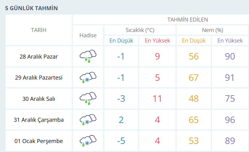 BURSA İÇİN 5 GÜNLÜK HAVA DURUMU TAHMİNİ