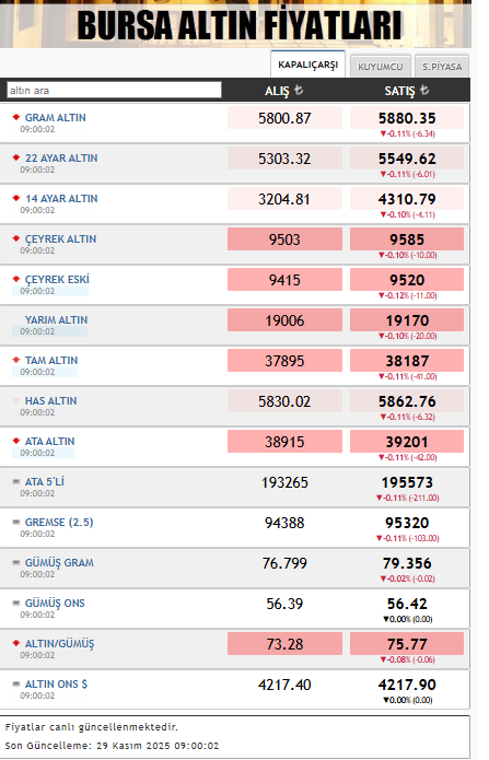 Kapalıçarşı ekranında gram altının alış fiyatı 5800 lira olurken, satış fiyatı 5880 lira seviyesinde gözlendi.