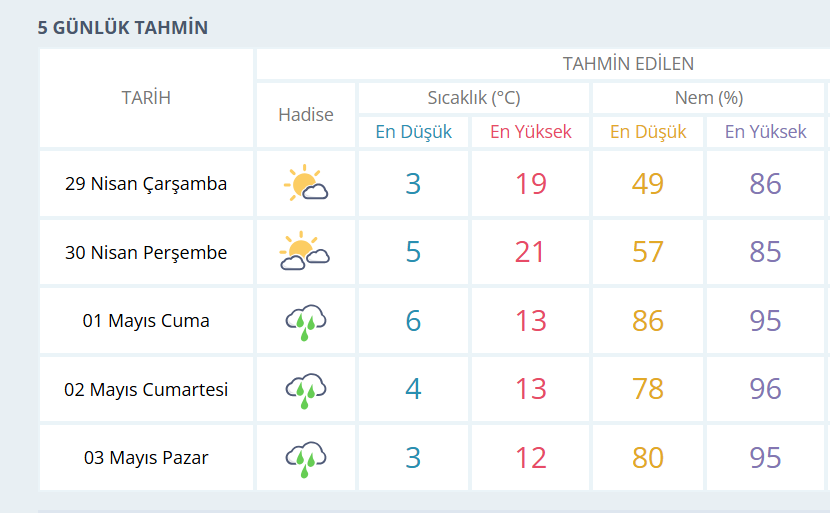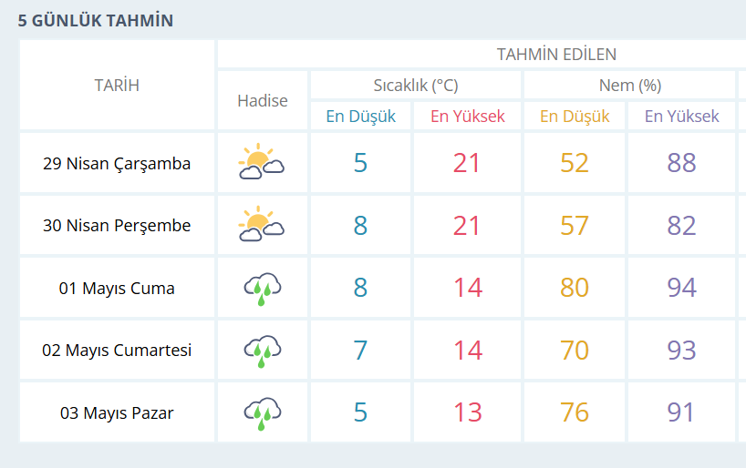 BURSA İÇİN 5 GÜNLÜK HAVA DURUMU TAHMİNİ
