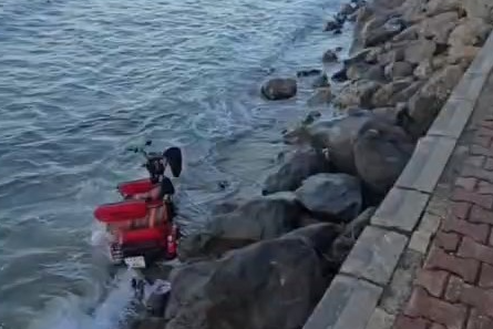 Alınan bilgiye göre, içerisinde iki kişinin bulunduğu 3 tekerlekli motosiklet; sürücüsünün direksiyon hakimiyetini kaybetmesi sonucu yaklaşık 3 metre yükseklikten önce kayalıkların üzerine düştü, ardından denize savruldu.