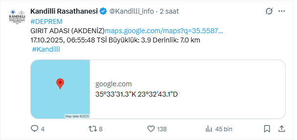 Kandilli Rasathanesi, sosyal medya hesabı üzerinden yaptığı paylaşımda Girit Adası'nda deprem meydana geldiğini duyurdu. Yapılan paylaşımda depremin 06.55'te 3.9 büyüklüğünde gerçekleşti. Deprem 7.0 kilometre derinlikte kaydedildi.