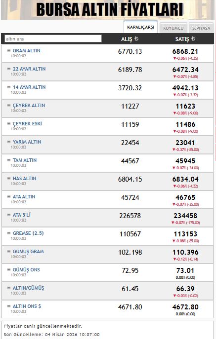 Gram altın 6.770 lira seviyesinden alınırken 6.8678 liradan satılıyor. 22 ayar altın 6.189 liradan alıcı bulurken satış fiyatı 6.472 lira olarak kaydedildi.