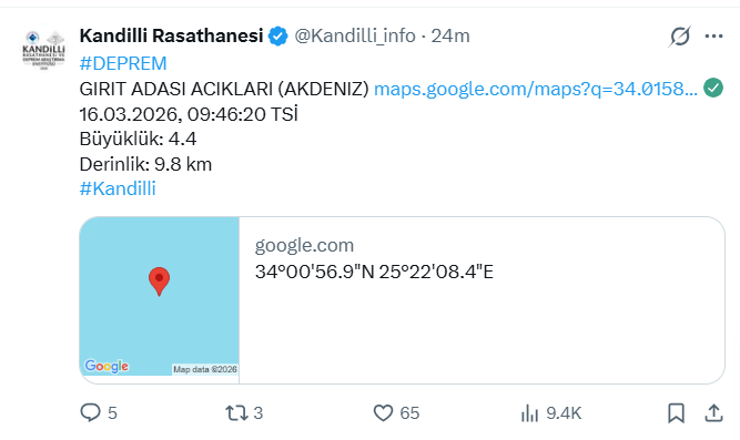 Kandilli Rasathanesi depreme ilişkin verileri sosyal medya hesabı üzerinden duyurdu. Yapılan paylaşımda depremin saat 09.46'da 4.4 büyüklüğünde meydana geldiği belirtildi. Akdeniz Girit Adası'nda gerçekleşen depremin derinliği 9.8 kilometre ölçüldü.