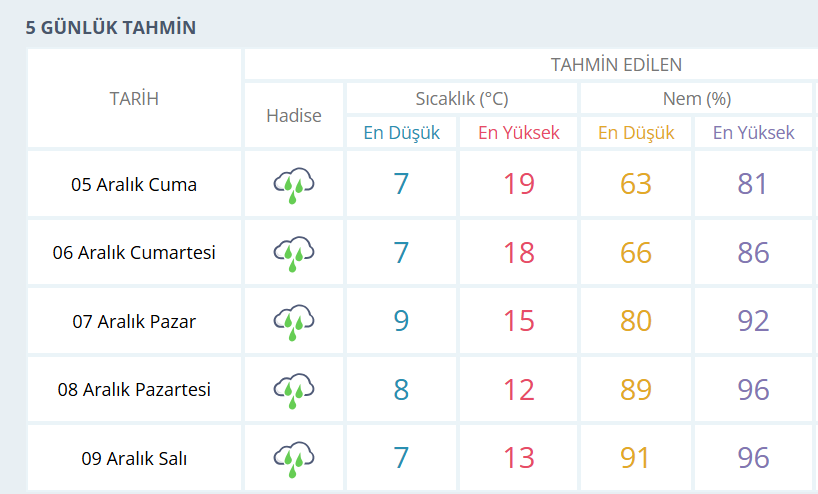 BURSA İÇİN 5 GÜNLÜK HAVA DURUMU TAHMİNİ