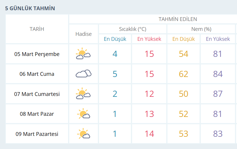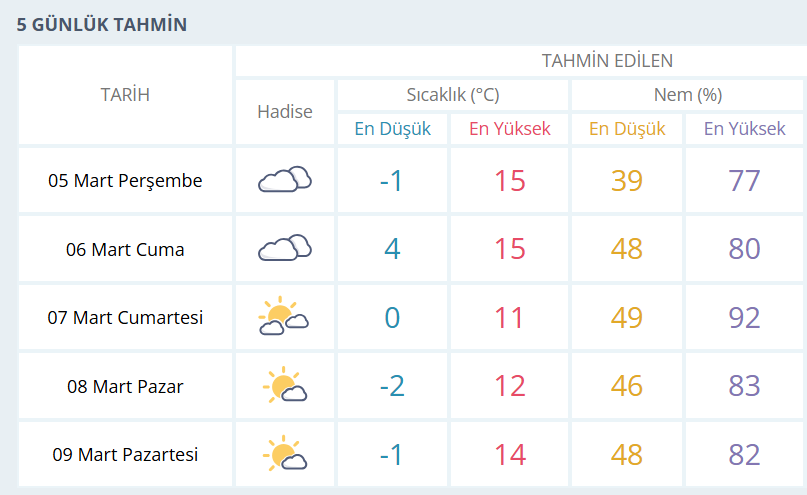 BURSA İÇİN 5 GÜNLÜK HAVA DURUMU TAHMİNİ