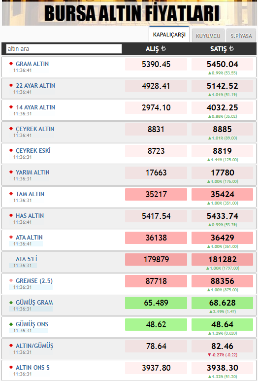 Bursa Kapalıçarşı’da gram altın 5.390,45 TL’den alıcı bulurken, satış fiyatı 5.450,04 TL olarak kaydedildi. Çeyrek altın, 8.831 TL’den alışa, 8.885 TL’den ise satışa konu oluyor. Yarım altın 17.663 TL’den alınırken, satış fiyatı 17.780 TL seviyelerinde. Tam altın ise Kapalıçarşı’da 35.217 TL’den alınıp, 35.424 TL'den satılıyor.