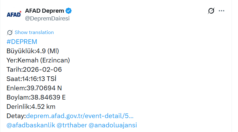 Erzincan'ın Kemah ilçesindeki 4.9 şiddetinde deprem meydana geldi. AFAD sarsıntıyla ilgili ilk verileri açıklarken Vali Hamza Aydoğdu, can ve mal kaybının bulunmadığını duyurdu.