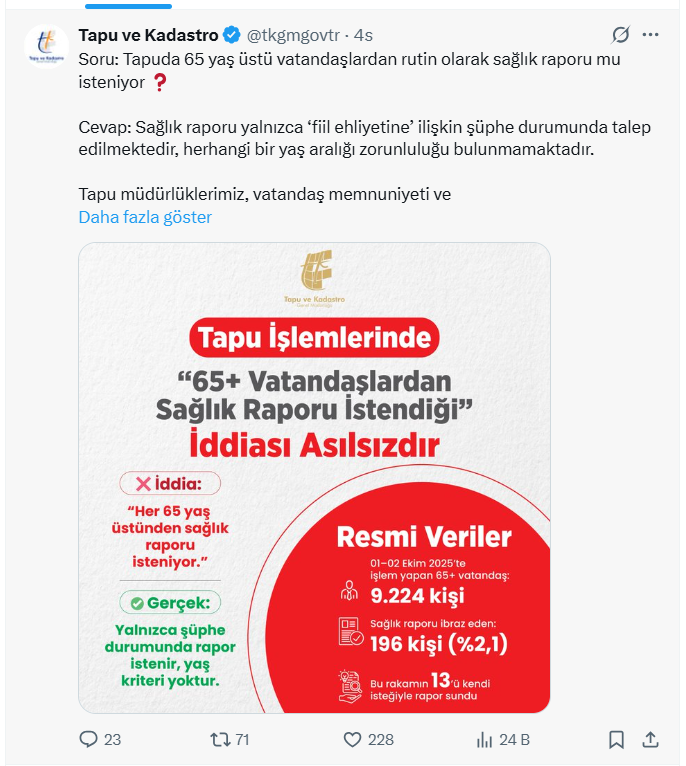 Paylaşımda, yaş sınırı gözetilmeksizin şüpheli görülen işlemlerde sağlık raporu talep edilebileceği vurgulandı. Tapu müdürlüklerinin, vatandaş memnuniyeti ve tapu sicilinin güvenliği için işlemleri daha hızlı, güvenli ve şeffaf şekilde yürütmeye devam ettiği ifade edildi.