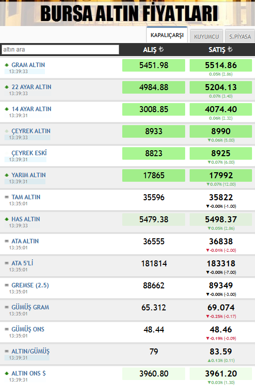 Bursa Kapalıçarşı’da gram altın 5451.98 TL’den alıcı bulurken, satış fiyatı 5514.86 TL olarak kaydedildi. Çeyrek altın, 8933 TL’den alışa, 8990 TL’den ise satışa konu oluyor. Yarım altın 17865 TL’den alınırken, satış fiyatı 17992 TL seviyelerinde. Tam altın ise Kapalıçarşı’da 35596 TL’den alınıp, 35822 TL'den satılıyor.