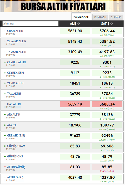 Bursa Kapalıçarşı’da gram altın 5631.90 TL’den alıcı bulurken, satış fiyatı 5706.44 TL olarak kaydedildi. Çeyrek altın, 9225 TL’den alışa, 9301 TL’den ise satışa konu oluyor. Yarım altın 18451 TL’den alınırken, satış fiyatı 18613 TL seviyelerinde. Tam altın ise Kapalıçarşı’da 36789 TL’den alınıp, 37084 TL'den satılıyor.