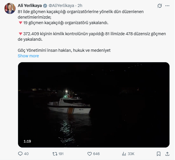 Paylaşımda, göç yönetiminin insan hakları, hukuk ve medeniyet değerlerine uygun şekilde; kamu düzeni ve güvenliğini önceleyen bir anlayışla ele alındığı vurgulandı. Yerlikaya, Türkiye’nin düzenli göç yönetimi, düzensiz göç ve göçmen kaçakçılığıyla mücadele, entegre sınır yönetimi, uluslararası koruma ile gönüllü, güvenli, onurlu ve düzenli geri dönüş başlıklarının tamamında dünyaya örnek bir politika izlediğini belirtti.
