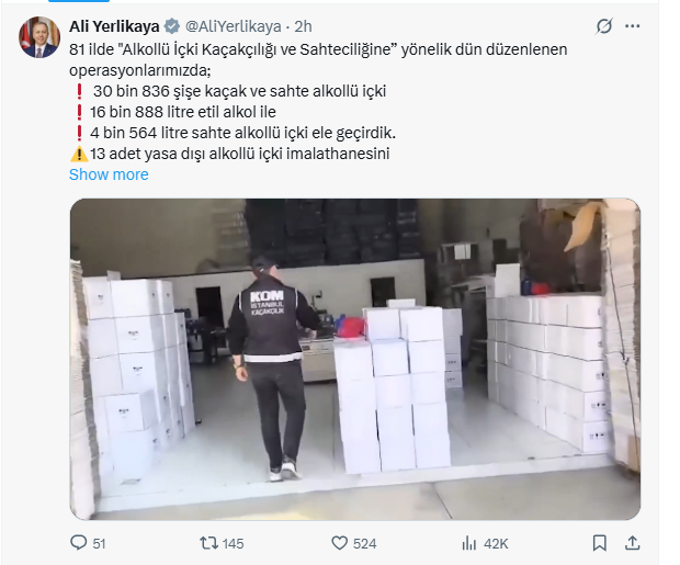 Bakan Yerlikaya, sahte alkol üretiminin yalnızca bir suç değil, aynı zamanda toplum sağlığını tehdit eden “ölümcül bir tuzak” olduğunu vurgulayarak, “Bu ürünleri piyasaya sürenler; hem vatandaşlarımızın sağlığını, hem de hayatını hiçe saymaktadır." dedi.