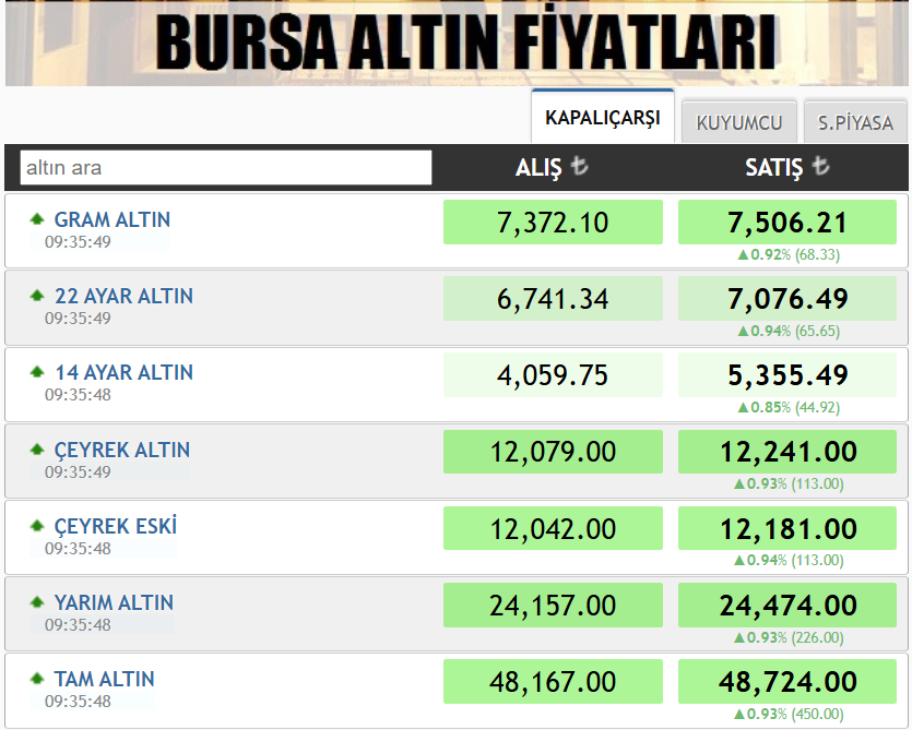 Çeyrek altın Bursa piyasasında 12.241 liradan satılırken, eski çeyrek altının satış fiyatı 12.181 lira olarak kaydedildi. Yarım altın 24.474 liradan işlem görürken, tam altın ise 48.724 liraya kadar yükseldi.