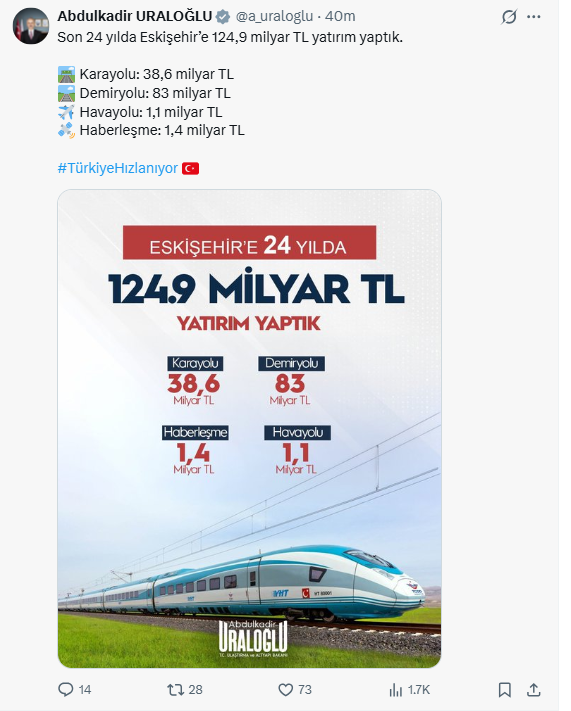 Bakan Uraloğlu, gerçekleştirilen yatırımların Eskişehir’in ulaşım altyapısını güçlendirdiğini ve kentin bölgesel kalkınmasına önemli katkı sunduğunu ifade etti.