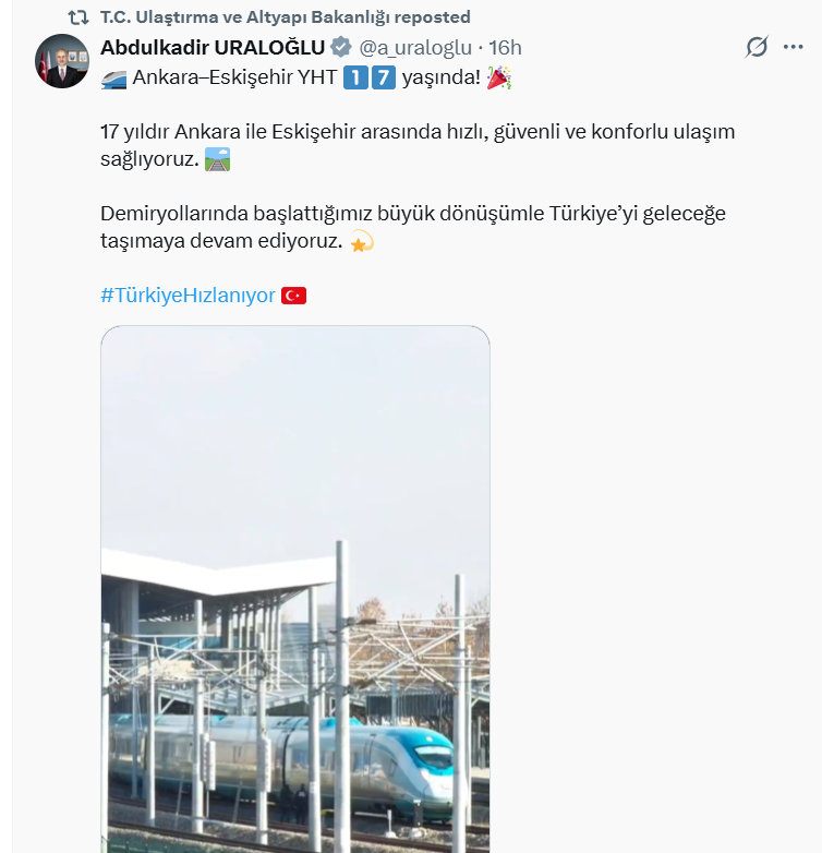 Abdulkadir Uraloğlu, Ankara–Eskişehir Yüksek Hızlı Tren Hattı’nın 17. yılını sosyal medya hesabından yaptığı paylaşımla kutladı. Uraloğlu, hattın 17 yıldır Ankara ile Eskişehir arasında hızlı, güvenli ve konforlu ulaşım sağladığını belirterek demiryollarındaki dönüşümün Türkiye’yi geleceğe taşıdığını ifade etti.