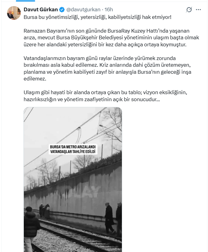 Kriz anlarında dahi çözüm üretilemediğini dile getiren Gürkan, yaşananların yalnızca teknik bir arıza olarak değerlendirilemeyeceğini, planlama ve yönetim kabiliyetindeki zafiyetin açık bir göstergesi olduğunu kaydetti. "Ulaşım gibi hayati bir alanda ortaya çıkan tablonun vizyon eksikliği ve hazırlıksızlığın sonucu olduğunu" ifade eden Gürkan, bu anlayışla Bursa’nın geleceğinin inşa edilemeyeceğini belirtti.