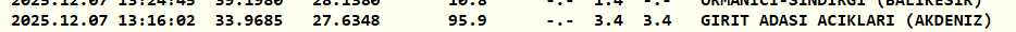 Resmi internet sitesi üzerinden alınan bilgilere göre deprem saat 13.16'da 3.4 büyüklüğünde gerçekleşti. Kandilli depremin 95.9 kilometre derinlikte meydana geldiğini belirtti.