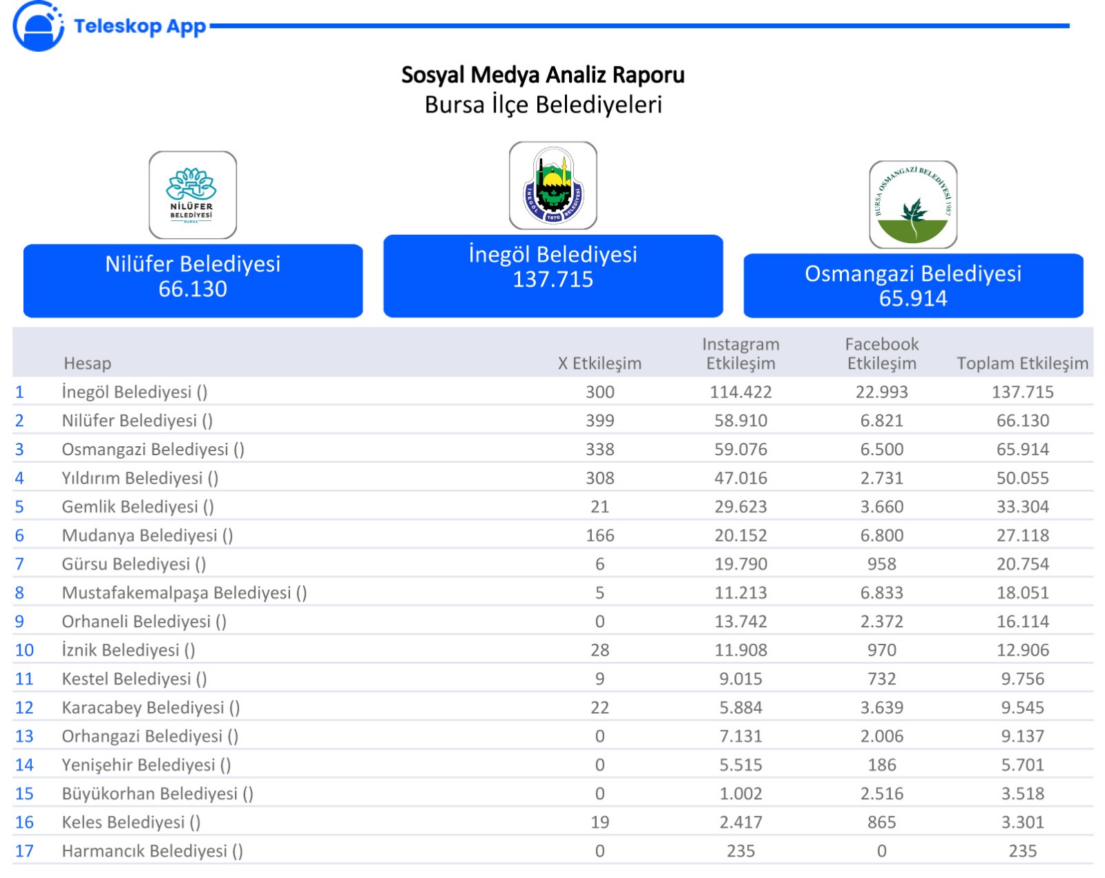 Belediyeler sıralamasında ise İnegöl Belediyesi de 137 bin 715 etkileşimle 1’nci sırada yer alırken, 66 bin 130 etkileşimle Nilüfer Belediyesi ikinci sırada, 65 bin 914 etkileşimle Osmangazi Belediyesi üçüncü sırada yer aldı.