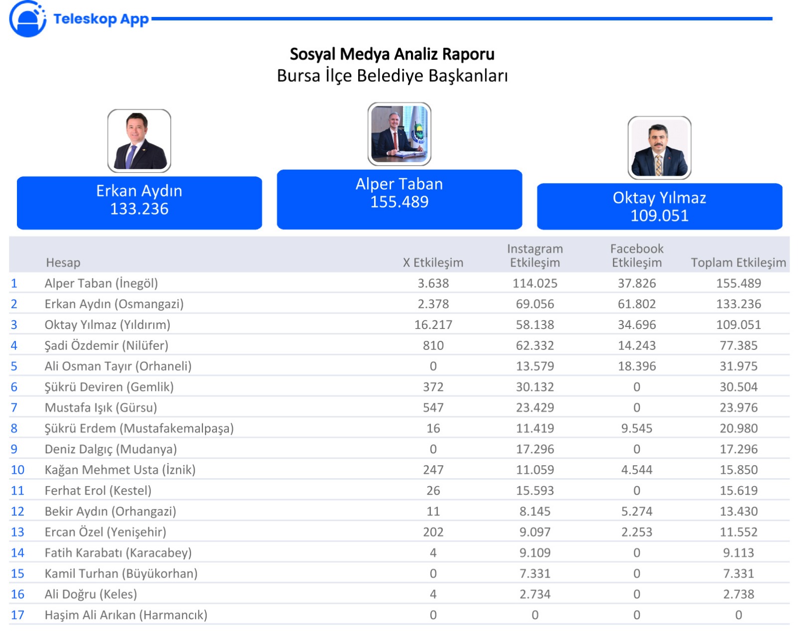 Listenin ikinci sırasında ise 133 bin 236 toplam etkileşimle Osmangazi Belediye Başkanı Erkan Aydın, üçüncü sırada ise 109 bin 51 toplam etkileşimle Yıldırım Belediye Başkanı Oktay Yılmaz yer aldı.