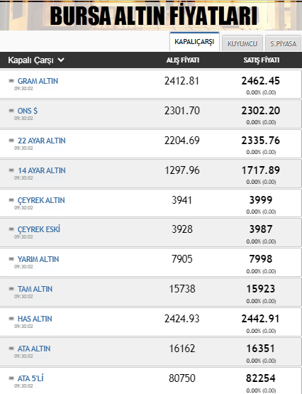 İŞTE GÜNCEL ALTIN FİYATLARI GRAM ALTIN: 2.462,45 ÇEYREK ALTIN: 3.999,00 YARIM ALTIN: 7.998,00 TAM ALTIN: 15.923,00