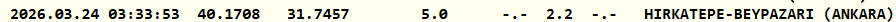 Alınan bilgilere göre deprem saat 03.33'te 2.2 büyüklüğünde gerçekleşti. Kandilli Beypazarı merkezli depremin derinliğini 5.0 kilometre olarak açıkladı.
