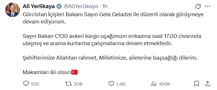 "Azerbaycan’dan ülkemize gelmek üzere havalanan bir C130 askerî kargo uçağımız Gürcistan-Azerbaycan sınırında düşmüştür. Arama kurtarma çalışmalarına Azerbaycan ve Gürcistan makamları ile koordineli olarak başlanmıştır."