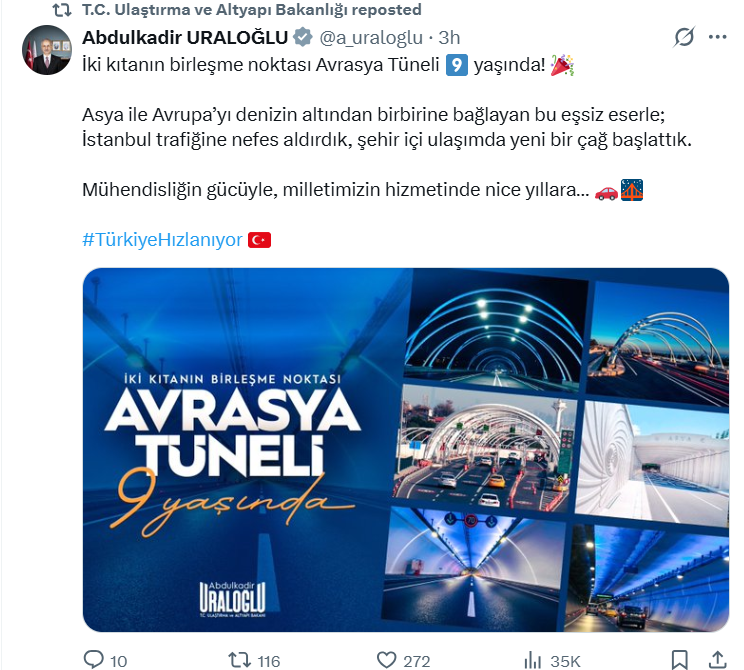 Ulaştırma ve Altyapı Bakanı Abdulkadir Uraloğlu, tünelin önemine dikkat çekerek, “Mühendisliğin gücüyle, milletimizin hizmetinde nice yıllara” ifadelerini kullandı.