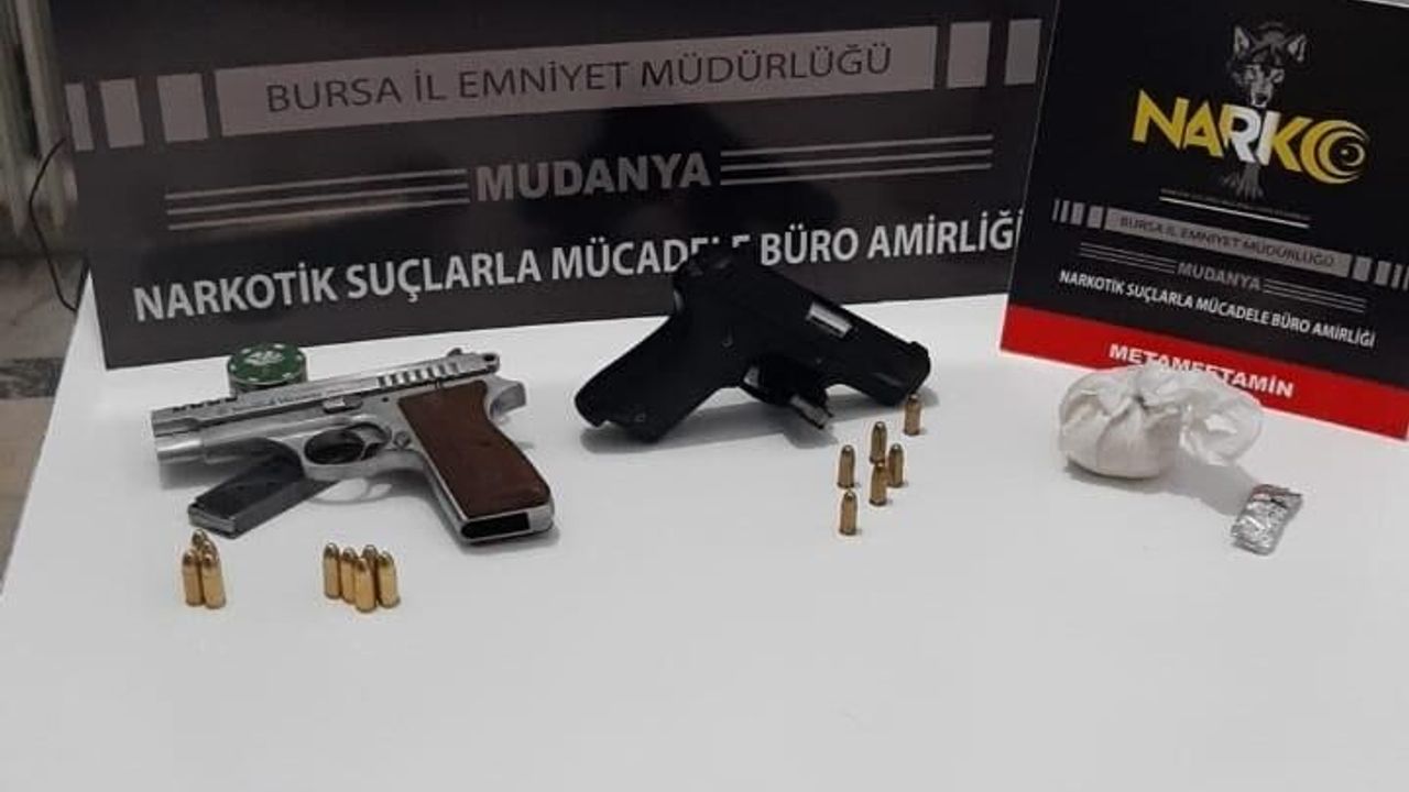 Mudanya ilçe Emniyet Müdürlüğü Narkotik Büro Amirliği ekipleri, uyuşturucu ticareti yaptı tespit ettikleri kişileri takibe aldı. Mudanya Altıntaş mevkiinde bağ evine yapılan uyuşturucu operasyonunda, U.B., A.S., F.S. ve S.Ç. gözaltına alındı. Kişilerin üzerinde ve evde yapılan aramada, 2 adet tabanca ve 87 gr metamfetamin ele geçirildi. Zanlılardan F.S.’nin silahlı yağma suçundan da arandığı tespit edilirken, yapılan sorgulamanın ardından 4 kişi, adliyeye sevk edildi.