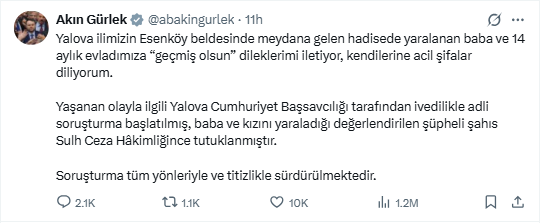 Adalet Bakanı Akın Gürlek, sosyal medya hesabı üzerinden yaptığı açıklamada, Yalova’nın Esenköy beldesinde yaşanan olayda yaralanan baba ile 14 aylık çocuğa geçmiş olsun dileklerini ileterek acil şifa temennisinde bulundu. Gürlek açıklamasının devamında, "Yaşanan olayla ilgili Yalova Cumhuriyet Başsavcılığı tarafından ivedilikle adli soruşturma başlatılmış, baba ve kızını yaraladığı değerlendirilen şüpheli şahıs Sulh Ceza Hâkimliğince tutuklanmıştır. Soruşturma tüm yönleriyle ve titizlikle sürdürülmektedir." ifadelerini kullandı.