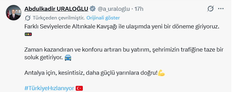 Uraloğlu, Antalya için ulaşım altyapısını geliştirmeye yönelik yatırımların süreceğini belirterek, daha güçlü ve kesintisiz ulaşım hedefi doğrultusunda çalışmaların devam ettiğini ifade etti.