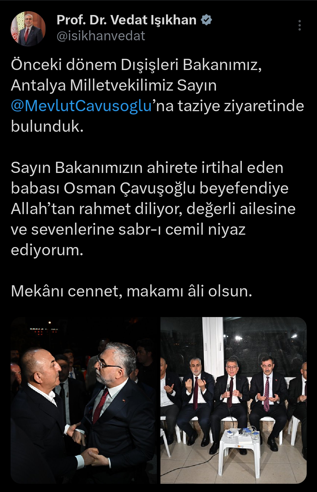 “Sayın Bakanımızın ahirete irtihal eden kıymetli babası Osman Çavuşoğlu beyefendiye Allah’tan rahmet diliyor; değerli ailesine ve sevenlerine sabr-ı cemil niyaz ediyorum. Mekânı cennet, makamı âli olsun,” ifadelerini kullandı.