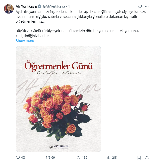 Yerlikaya, paylaşımında öğretmenlerin Türkiye’nin dört bir yanında umut yeşerttiğini belirterek, yetiştirilen her öğrencinin “Türkiye Yüzyılı” vizyonunun en güçlü harcı olduğunu dile getirdi. Öğretmenlik mesleğinin onurlu bir görev olduğunu söyleyen Bakan Yerlikaya, "Bu onurlu mesleği yerine getirdiğiniz için sizlere minnettarız. Başöğretmen Gazi Mustafa Kemal Atatürk’ü saygıyla anıyor, tüm öğretmenlerimizin 24 Kasım Öğretmenler Günü’nü yürekten kutluyorum." dedi.