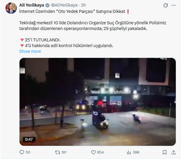 Bakan Yerlikaya’nın paylaşımına göre, Tekirdağ merkezli olmak üzere 10 ilde, dolandırıcı organize suç örgütüne yönelik eş zamanlı operasyonlar düzenlendi. Polis ekiplerince gerçekleştirilen operasyonlarda toplam 29 şüpheli yakalandı. Şüphelilerden 25’i tutuklanırken, 4’ü hakkında adli kontrol hükümleri uygulandı.
