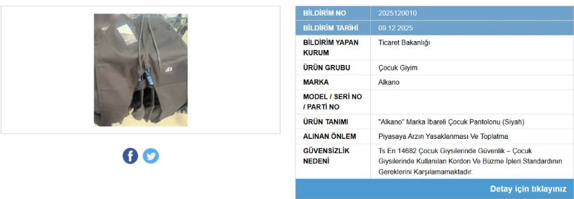 "Alkano" marka çocuk pantolonunda yapılan incelemede, bel kısmındaki ipin uygunsuz olduğu tespit edildi. Kordon ve büzme iplerinin standarda uymadığı belirtilirken, ürünün “yaralanma” tehlikesi barındırdığı ifade edildi.