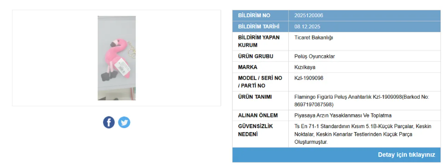 Piyasadan toplatılma kararı verilen bir diğer ürün ise pelüş oyuncak oldu. "Kızılkaya" marka "Flamingo Figürlü Pelüş Anahtarlık"ın "boğulma" riski taşıdığı duyuruldu.