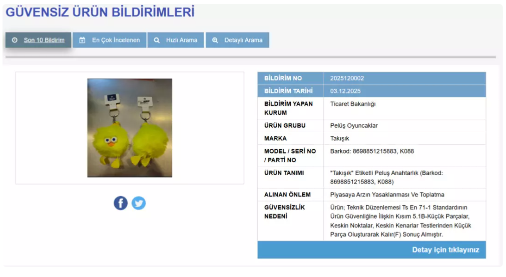 Bakanlık, denetimler sonucunda Takışık markasına ait bir oyuncak aksesuarın kullanımının güvenli olmadığını belirledi.