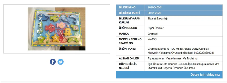 Tarım ve Orman Bakanlığı riskli gıdaları tespit etmeye devam ederken, Ticaret Bakanlığı da Güvensiz Ürün Bilgi Sistemi üzerinden tehlike arz eden ürünleri açıklıyor. Son olarak bir oyuncağın güvensiz olduğu duyuruldu.
